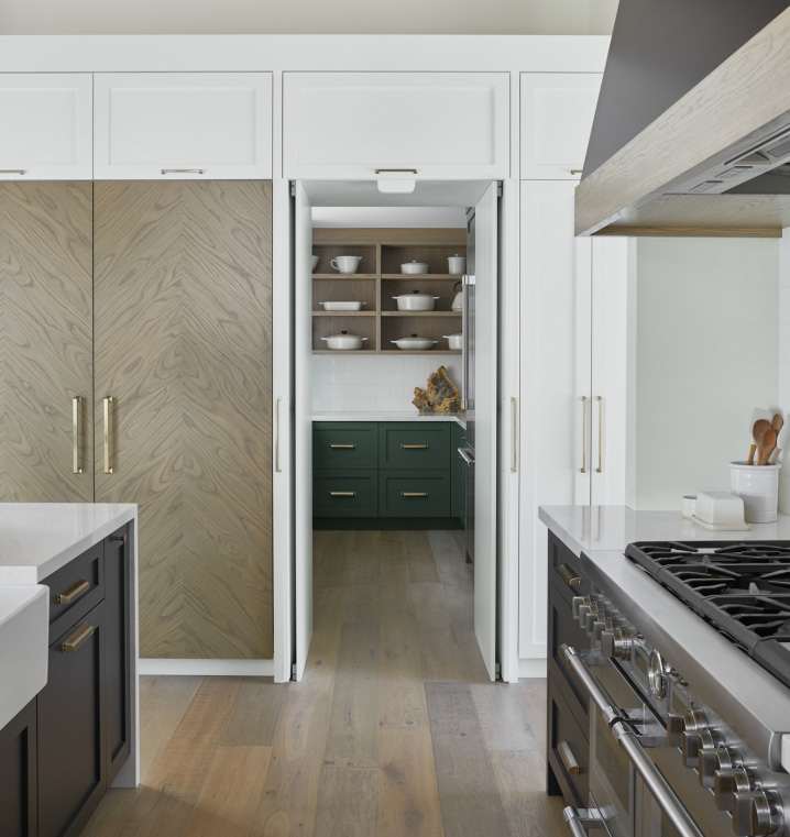 The heart of the home is a fully-equipped kitchen designed for entertaining, featuring a vibrant green pantry hidden behind integrated millwork and a covered outdoor cooking station. Room adjacencies support everything from recipe testing to lively dinner parties.
