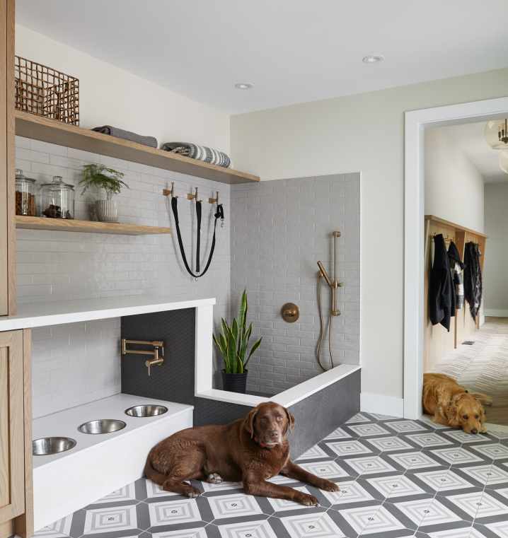A two-part mudroom includes a custom dog shower, integrated food stations, and durable flooring, ensuring comfort for the client’s dogs without compromising on style.