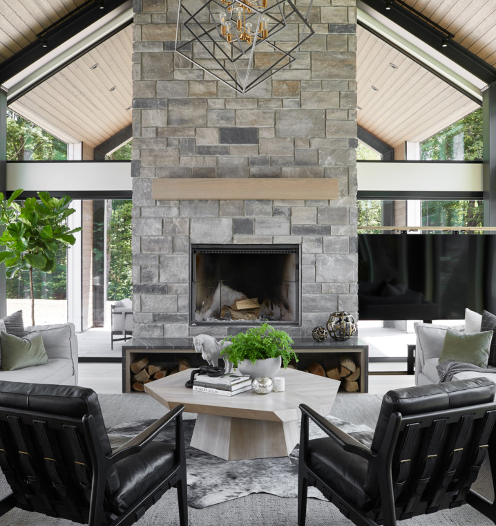 To reflect the client’s personality, we paired glass and steel with warm wood tones, textured furnishings, and layered lighting. Custom details; like rope-accented furniture, angled hardwood flooring, and millwork, bring depth and warmth, while a double-sided stone fireplace anchors the open concept space with cozy ambiance. Designed for comfort, durability, and livability, the home feels as grounded as it is elevated.