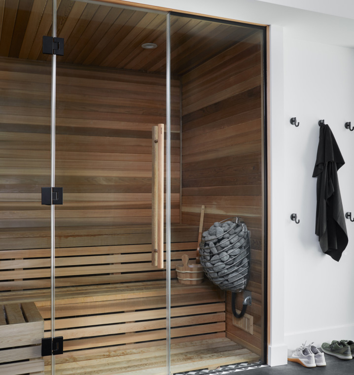 The lower level features a fully outfitted gym and cedar-clad rock sauna. A dedicated music room encourages daily creativity, while natural light and views promote calm and wellbeing throughout.